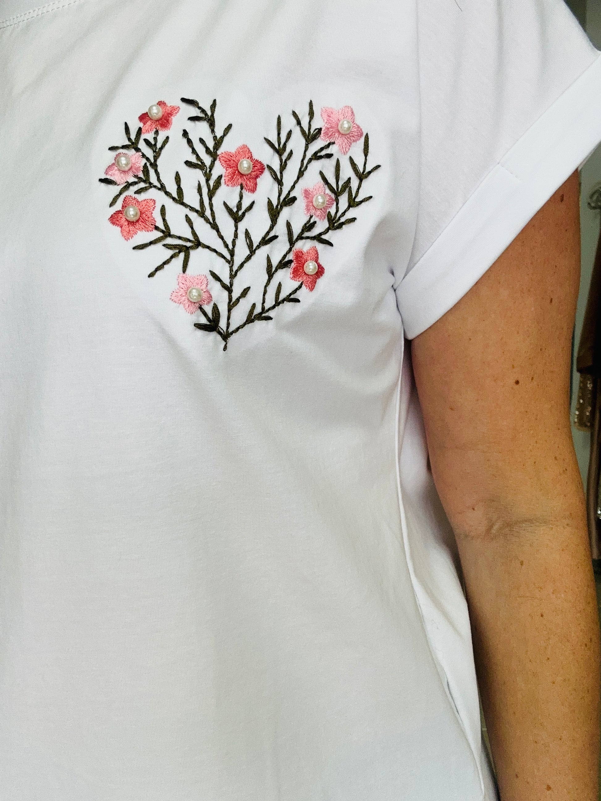 cute floral heart tee design in a white Tshirt, perfect for a casual look. Wear with jeans, skirts or shorts.