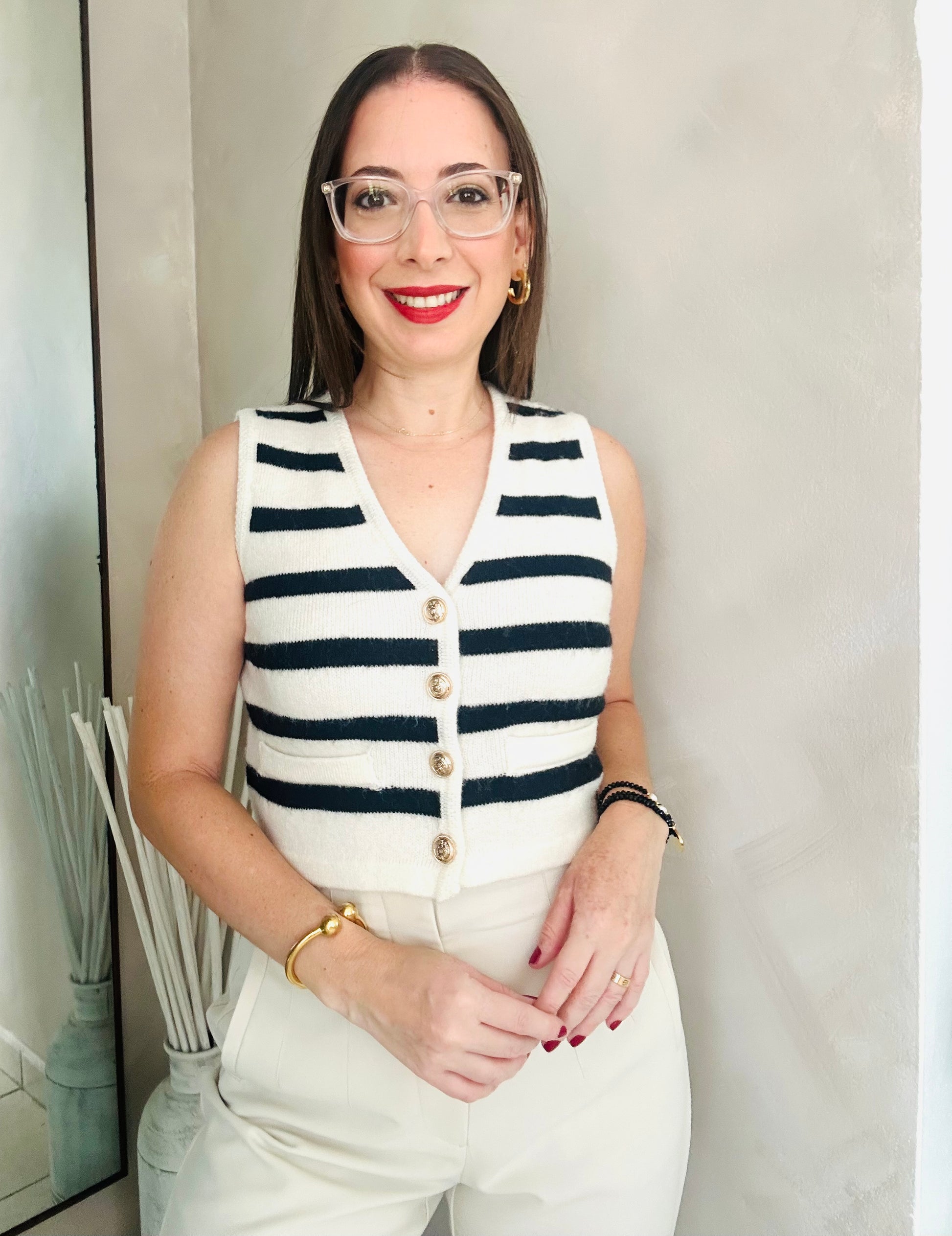 Knit Cropped Stripes Vest with metal buttons. Waist length