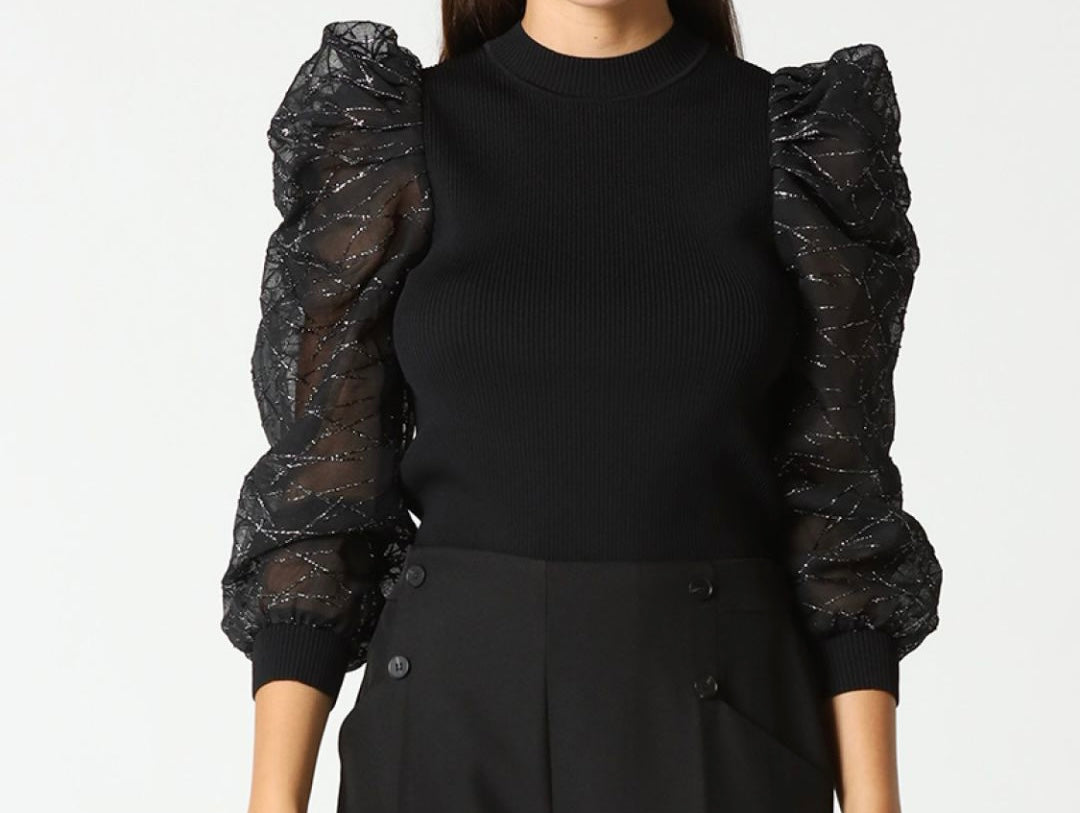 Silver / Black Sheer Puff Sleeve Top