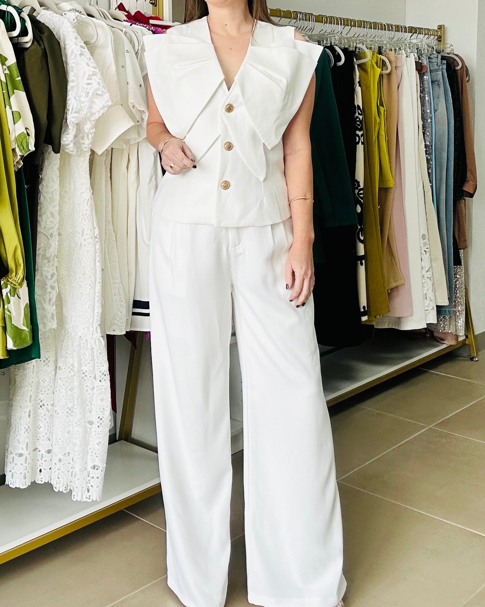Elegant white Gold buttons blouse and pants set by Gracia. This fabulous, Chic exclusive Gracia Brand set of white top with gold buttons. And high waisted zipper front with elastic back pants *Sold separately