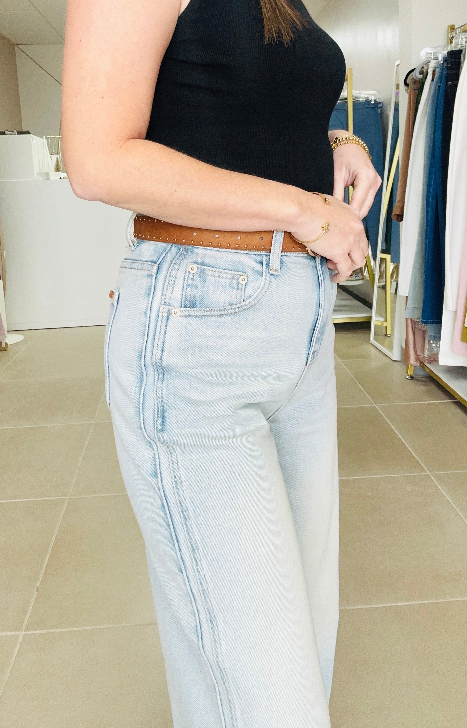 High waisted wide leg jeans with belt included.